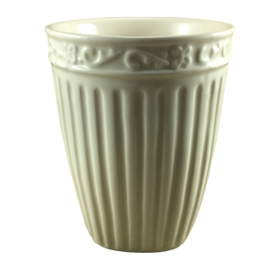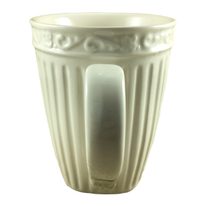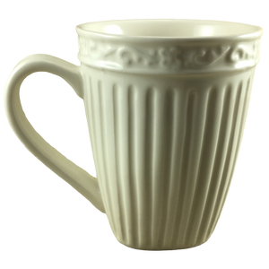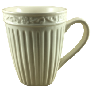 This is the largest mug we carry in the Italian Countryside collection. It features a ribbed design with swirled accent trim at the rim.