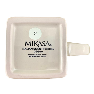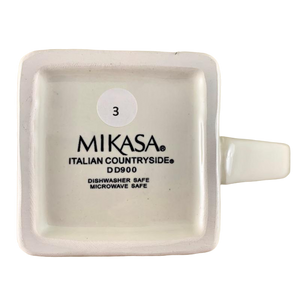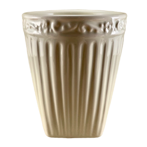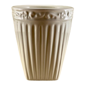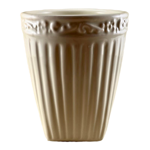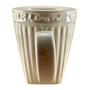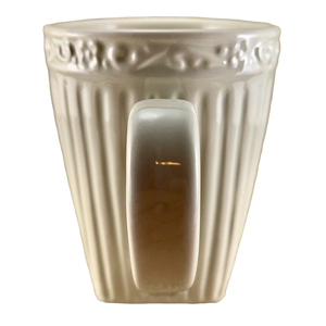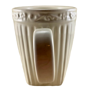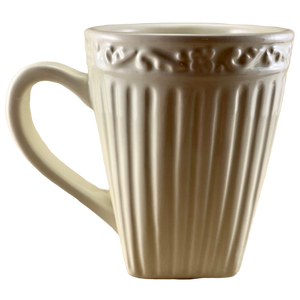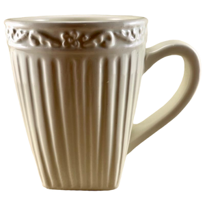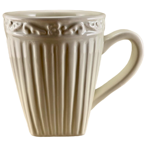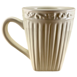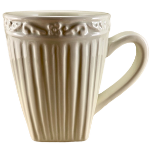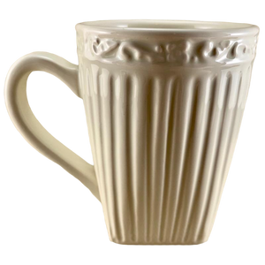 This is the largest mug we carry in the Italian Countryside collection. It features a ribbed design with swirled accent trim at the rim.