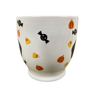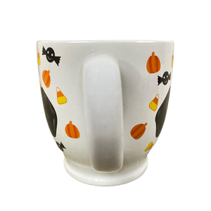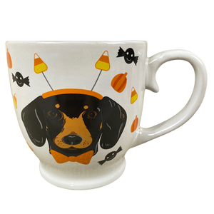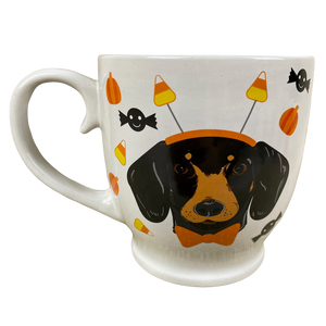 Features the same artwork on the front and rear surface consisting of a Dachshund wearing an orange bow tie and a hat made of two candy corns antennae.