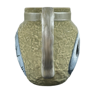This mug also has silver brushed appearance trim wrapping around the exterior surface beneath the rim. This brushed appearance also continues on to the handle.