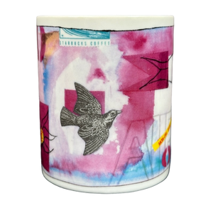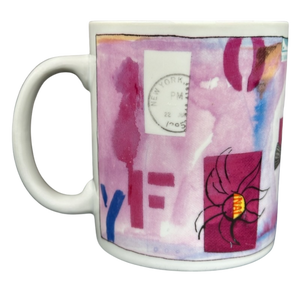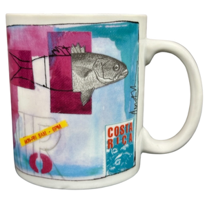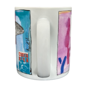 This vintage mug features artwork wrapping around its exterior surface depicting multiple things that I beleivre are all related to Costa Rica.