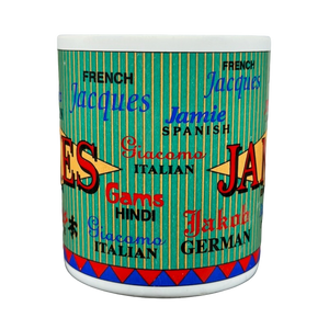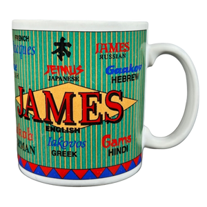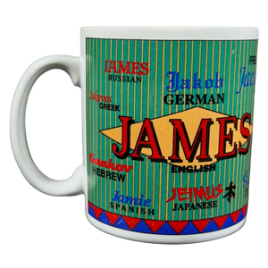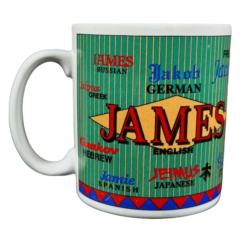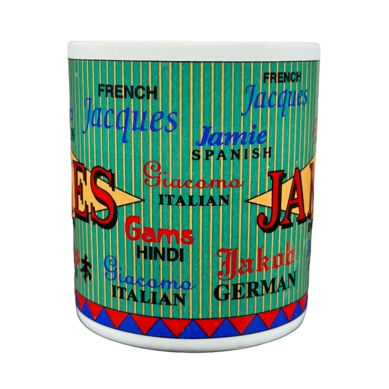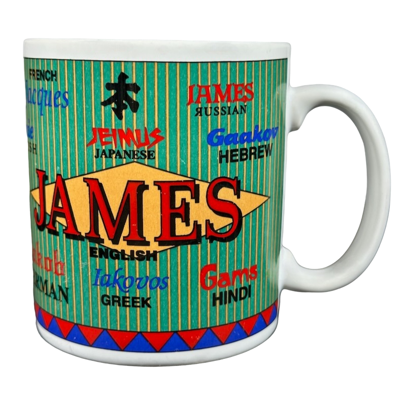 Wrapping around the exterior surface are translations of the name JAMES in many languages.