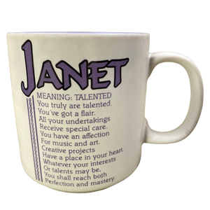 Features the name JANET printed in a large font at the top of the front side of the mug. Directly underneath this is a poem about the name JANET.