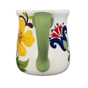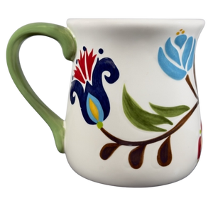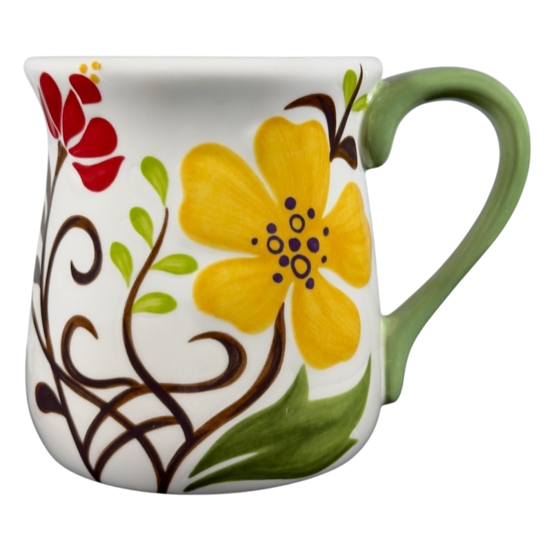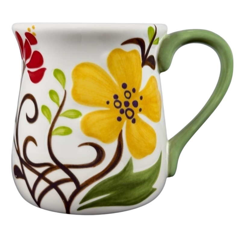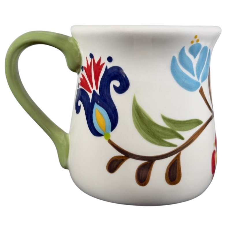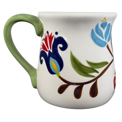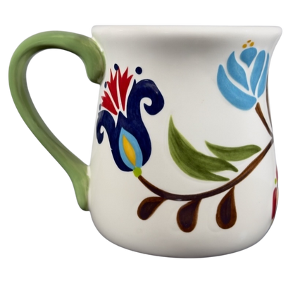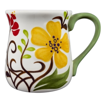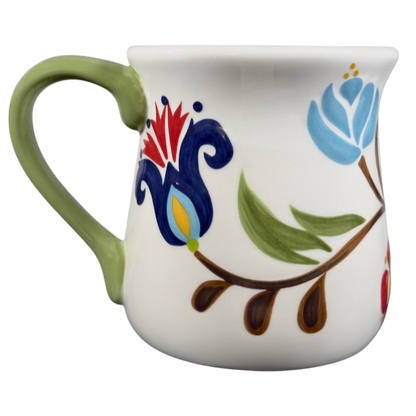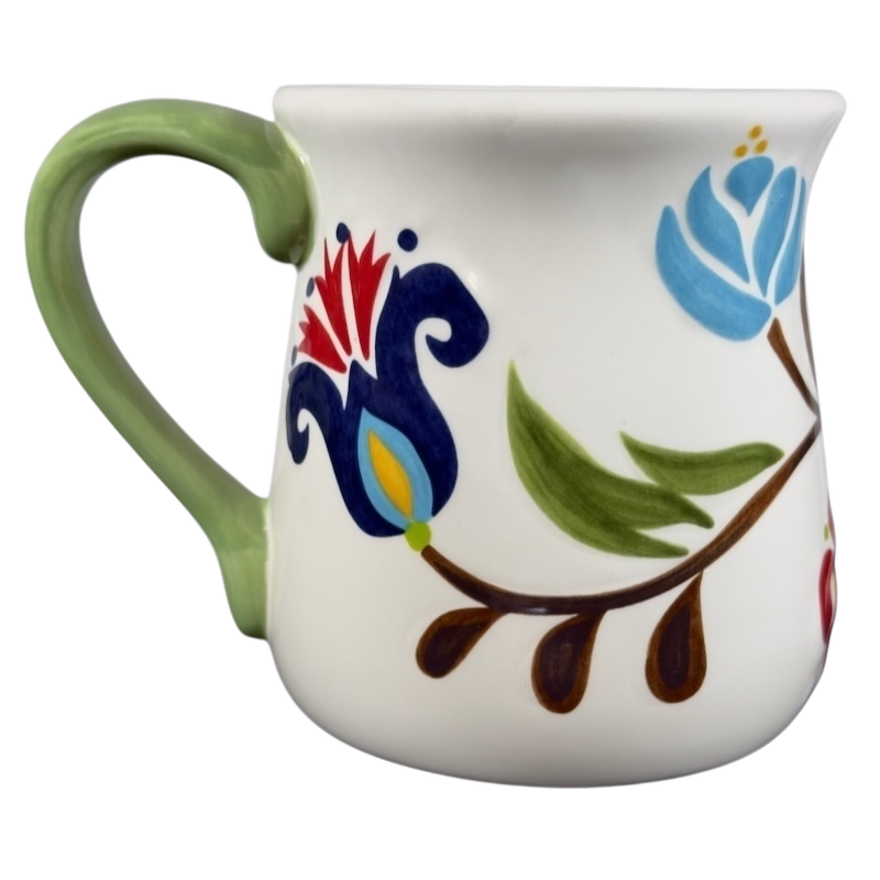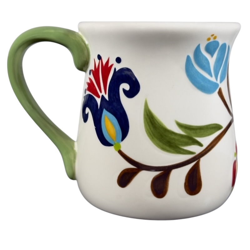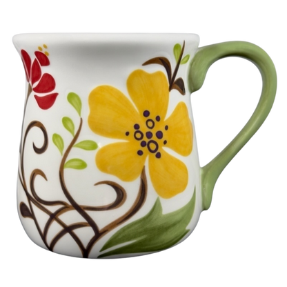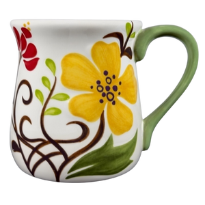 This is a beautiful oversized mug with lightly embossed floral artwork wrapping around its exterior surface.