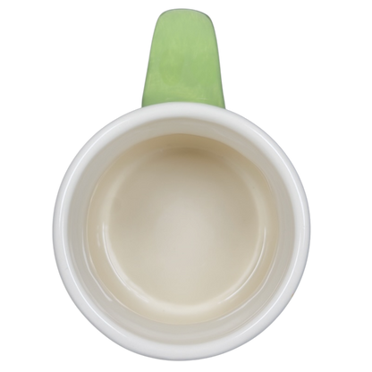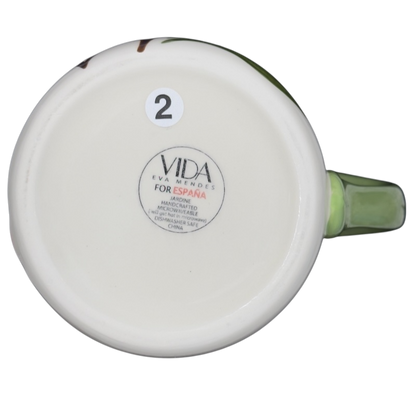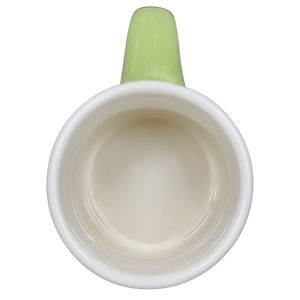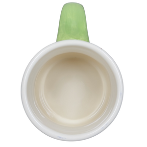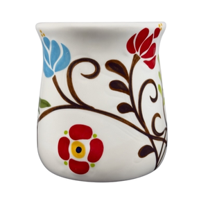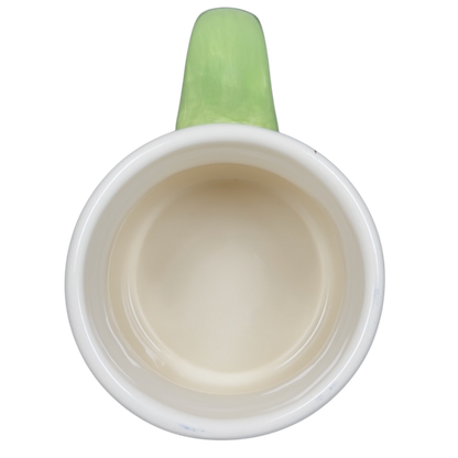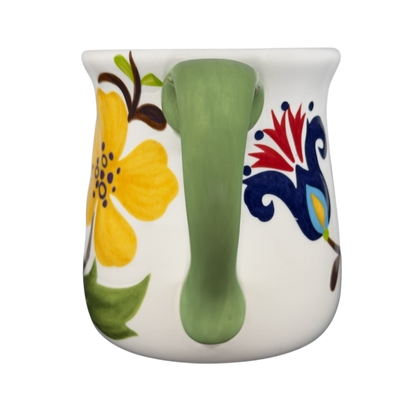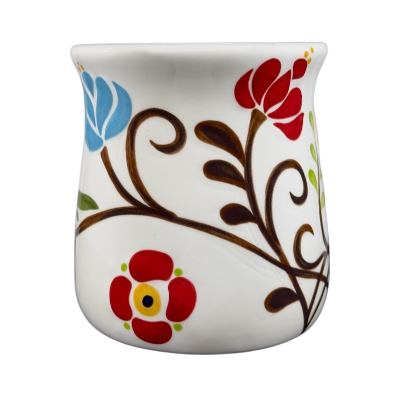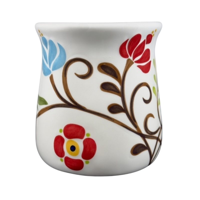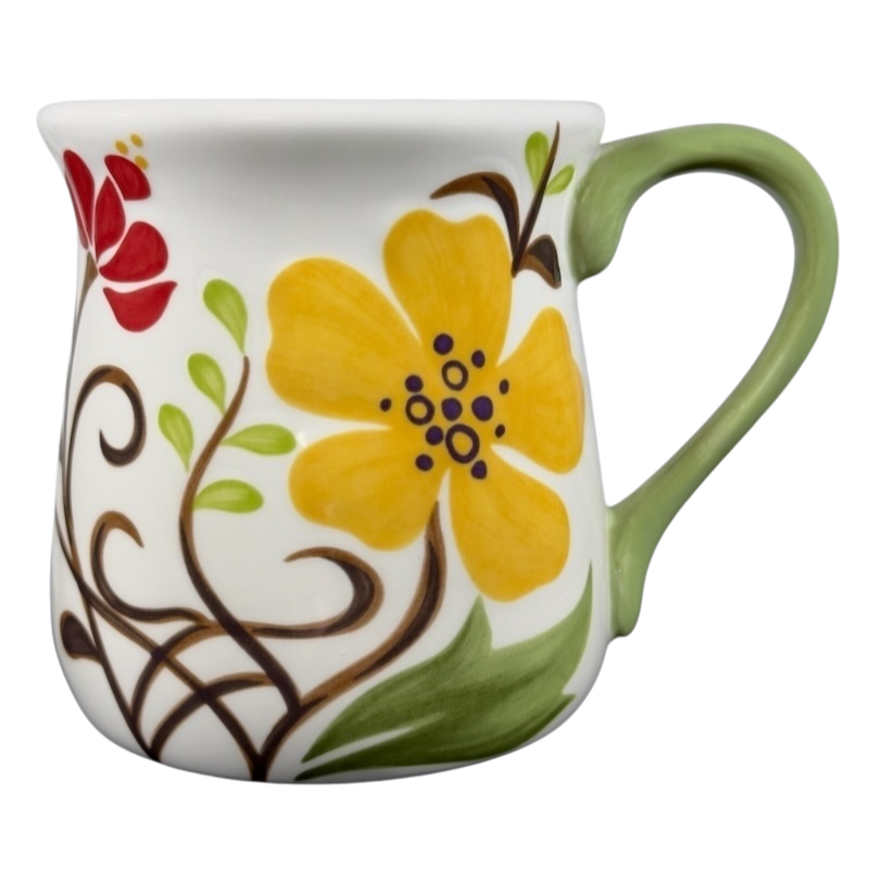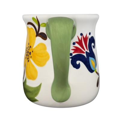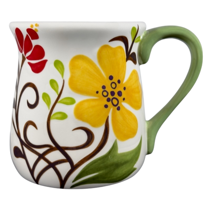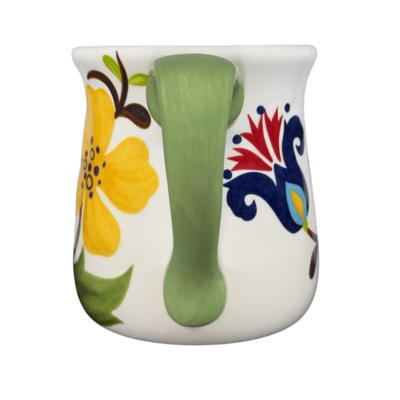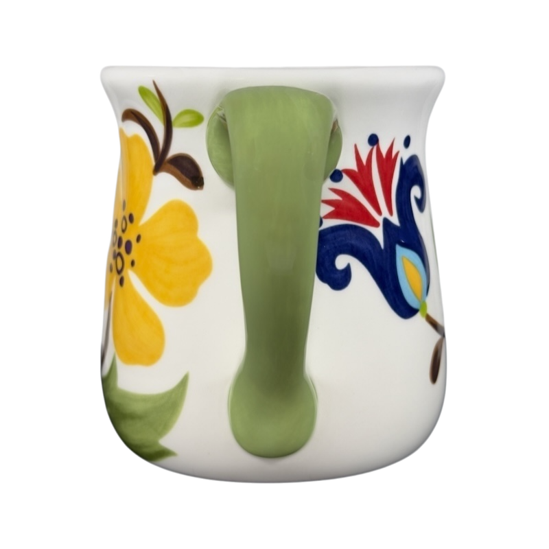 This is a beautiful oversized mug with lightly embossed floral artwork wrapping around its exterior surface.