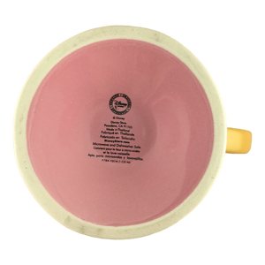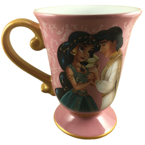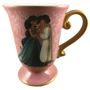Features an image of Jasmine and Aladdin on its front surface and a different image of them on its rear surface. There is also very lightly embossed abstract artwork wrapping around the exterior surface of this mug.