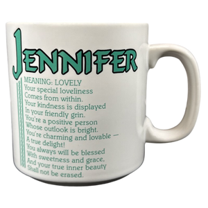 Features the name JENNIFER printed in a large font at the top of the front side of the mug. Directly underneath this is a poem about the name JENNIFER.