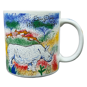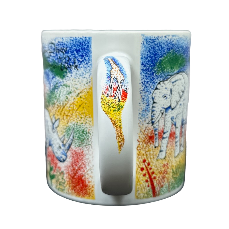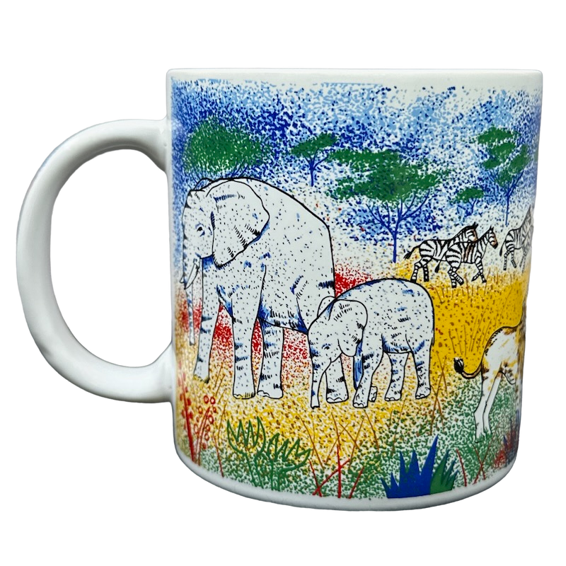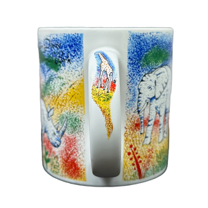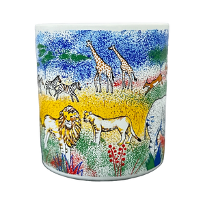 It features vibrant artwork by Jill Gotschalk wrapping around its exterior surface and on the handle depicting many African animals.