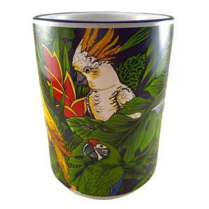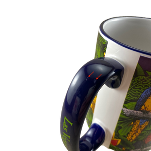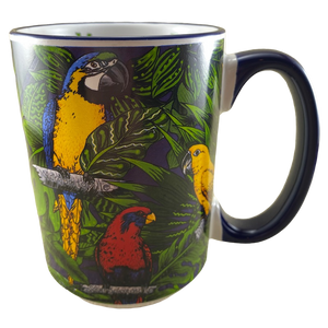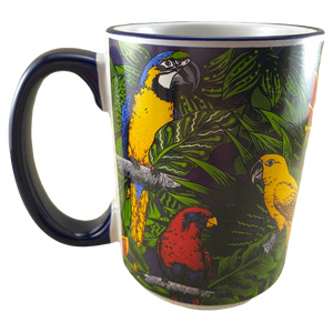 This mug features beautiful artwork wrapping around its exterior surface consisting of colorful birds sitting in trees.