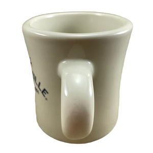 This is a heavy diner style mug. It features artwork on the front surface consisting of an airplane with Jimmy Buffett's signature above it and "JAMAICA" printed below it. To the left of the plane is printed "est." and to the right "2001."
