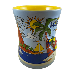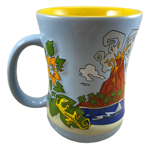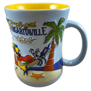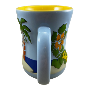 Features beautiful embossed artwork wrapping around its exterior surface consisting of a parrot in a hammock, palm trees, an airplane, a sailboat, a volcano, a gecko, and more!