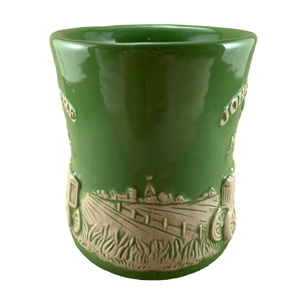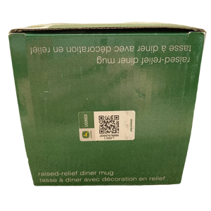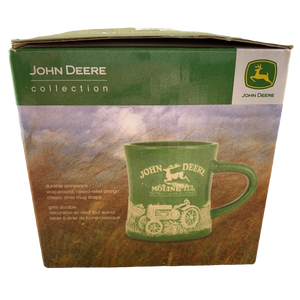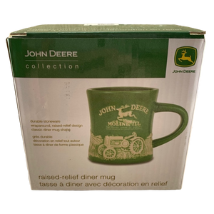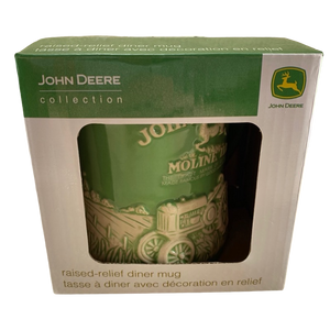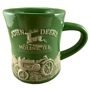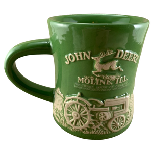 Features raised relief artwork wrapping around its exterior surface depicting a John Deere tractor sitting on farmland.