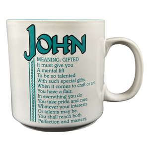 Features the name JOHN printed in a large font at the top of the front side of the mug. Directly underneath this is a poem about the name JOHN.