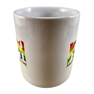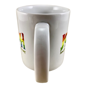 Features the same artwork on its front and rear surface consisting of the following printed in a rainbow like colorful font: