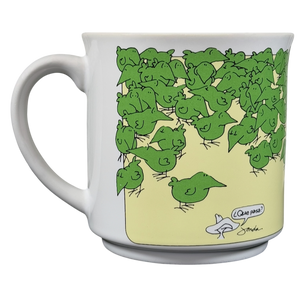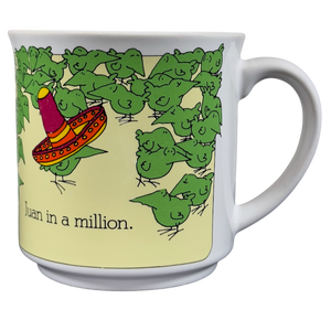 Features a green bird wearing a sombrero among a "million" other green birds. Under the bird is printed, "Juan In A Million."