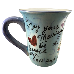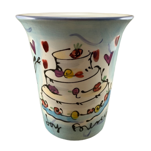 Features images of hearts, stars, and a wedding cake wrapping around its exterior surface.