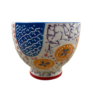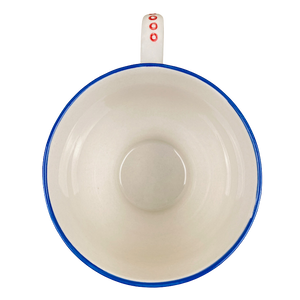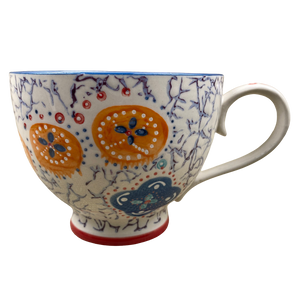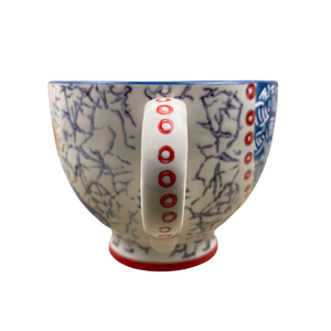 This is a footed mug with a red painted ring around the base and blue trim on the rim.