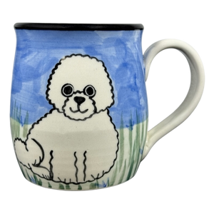 Features a Bichon Frise on its front surface standing in a grass field with blue flowers and a blue sky overhead.