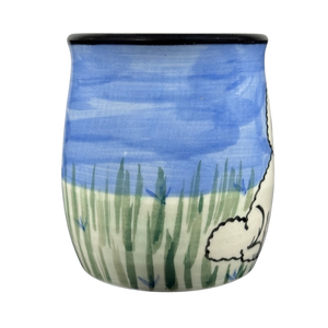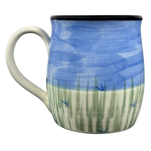 The grass field and flowers and sky wrap completely around the entire exterior surface of this mug.
