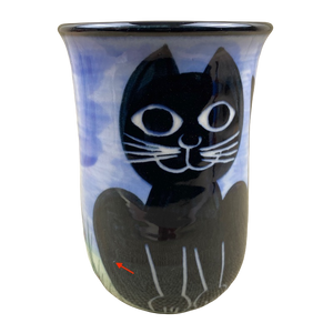 Features a black cat sitting among a floral landscape on its exterior surface.