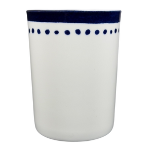 Below this a a ring of trim comprised of blue polka dots wrapping around its exterior surface.