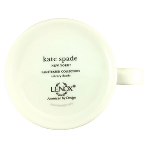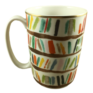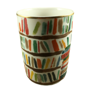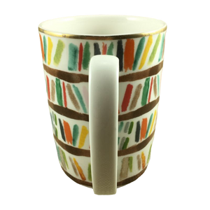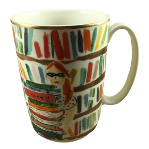 Features an abstract book shaped pattern wrapping around this mugs exterior surface. On the front is an illustration of a woman behind a stack of books.