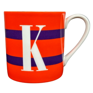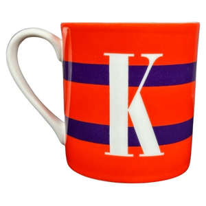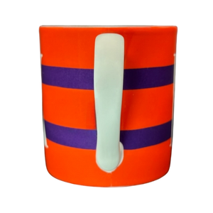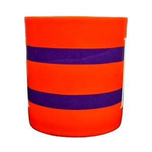Features alternating orange and purple bands wrapping around its exterior surface.