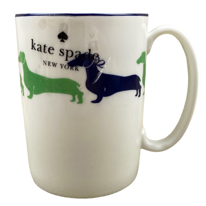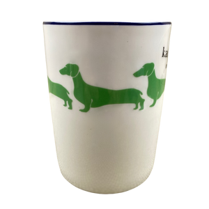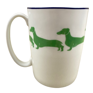 Features 5 green and 1 black silhouettes of a dachshund wrapping around its exterior surface.
