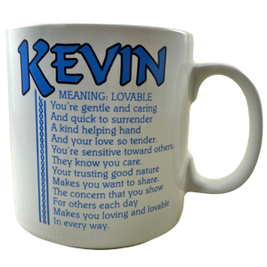 Features the name Kevin printed in a large font at the top of the front side of the mug. Directly underneath this is a poem about the name Kevin.