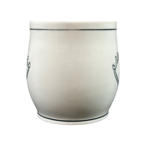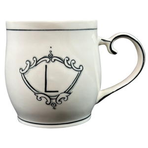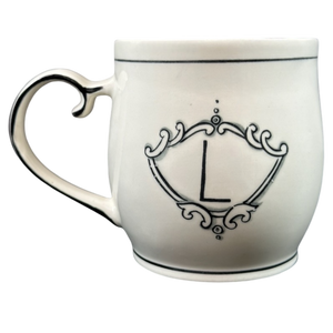 This gently footed mug features the same framed letter "L" on its front and rear surface.