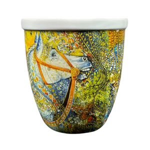 Features beautiful artwork wrapping around the exterior surface of Lady Godiva sitting on and resting her head on a horse.