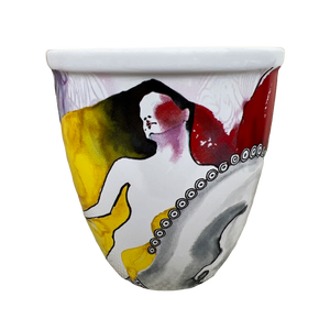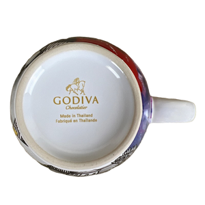 Features beautiful watercolor style artwork wrapping around the exterior surface depicting Lady Godiva sitting on a horse.