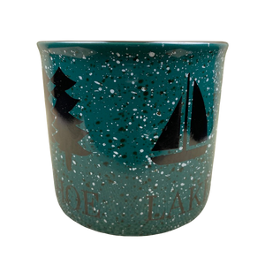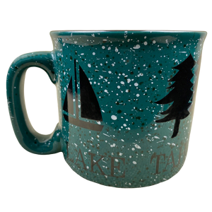 Features 2 trees and a sailboat silhouetted on its front and rear surface with "LAKE TAHOE" printed in a large black font beneath them.