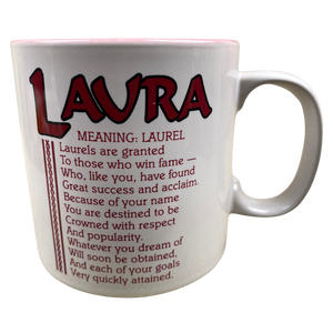 Features the name LAURA printed in a large font at the top of the front side of the mug. Directly underneath this is a poem about the name LAURA.
