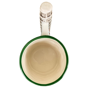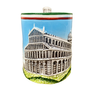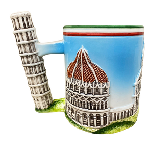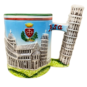 This is an extremely unique mug! It features an embossed design wrapping around its exterior surface that depicts the buildings in Pisa!