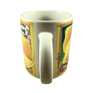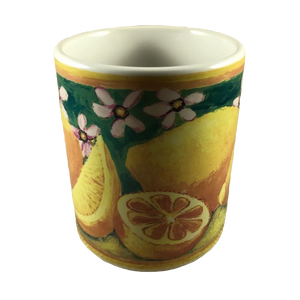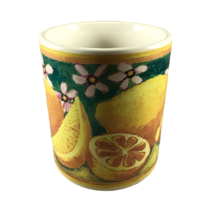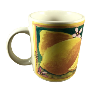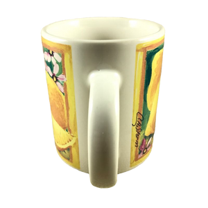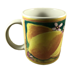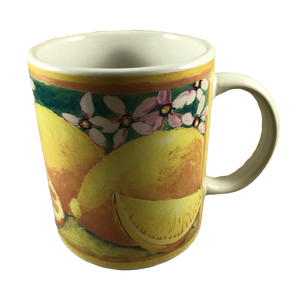 Features artwork wrapping around the mug consisting of lemons and pink flowers. Some of the lemons are sliced into opieces, others are whole.