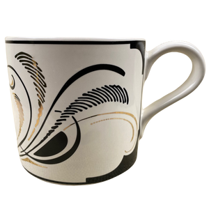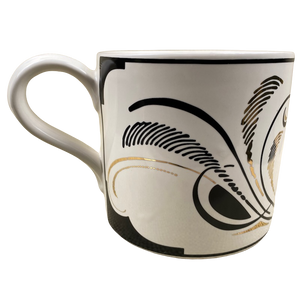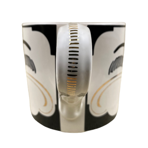 Wrapping around the exterior surface and on the handle is abstract art in gold and black.