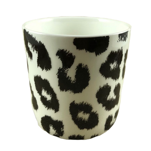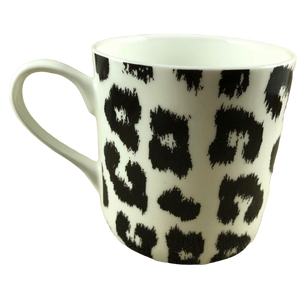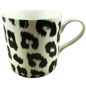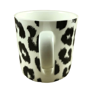 Features a leopard skin abstract pattern wrapping around its exterior surface. The spots on this mug are black against a white background.