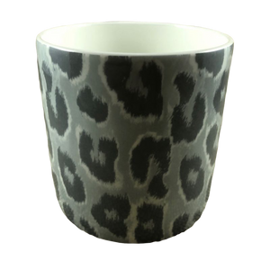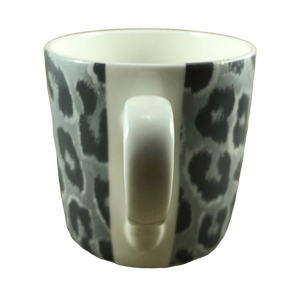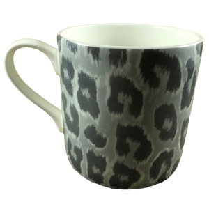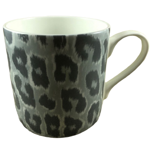 Features a leopard skin abstract pattern wrapping around its exterior surface. The spots on this mug are gray against a lighter gray background.