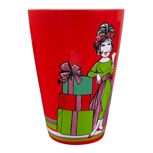 Features an image of a woman standing next to and leaning on 3 large gift boxes on its front surface.