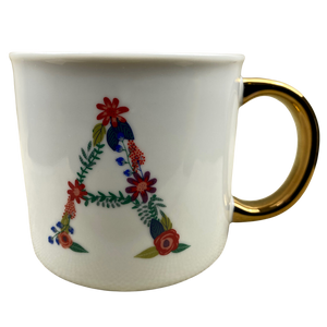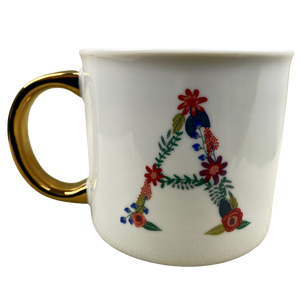 This beautiful mug features a large letter "A" on its front and rear surface that is entirely filled in with floral artwork.