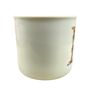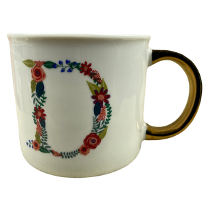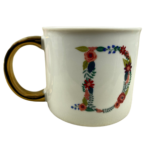 This beautiful mug features a large letter "D" on its front and rear surface that is entirely filled in with floral artwork.