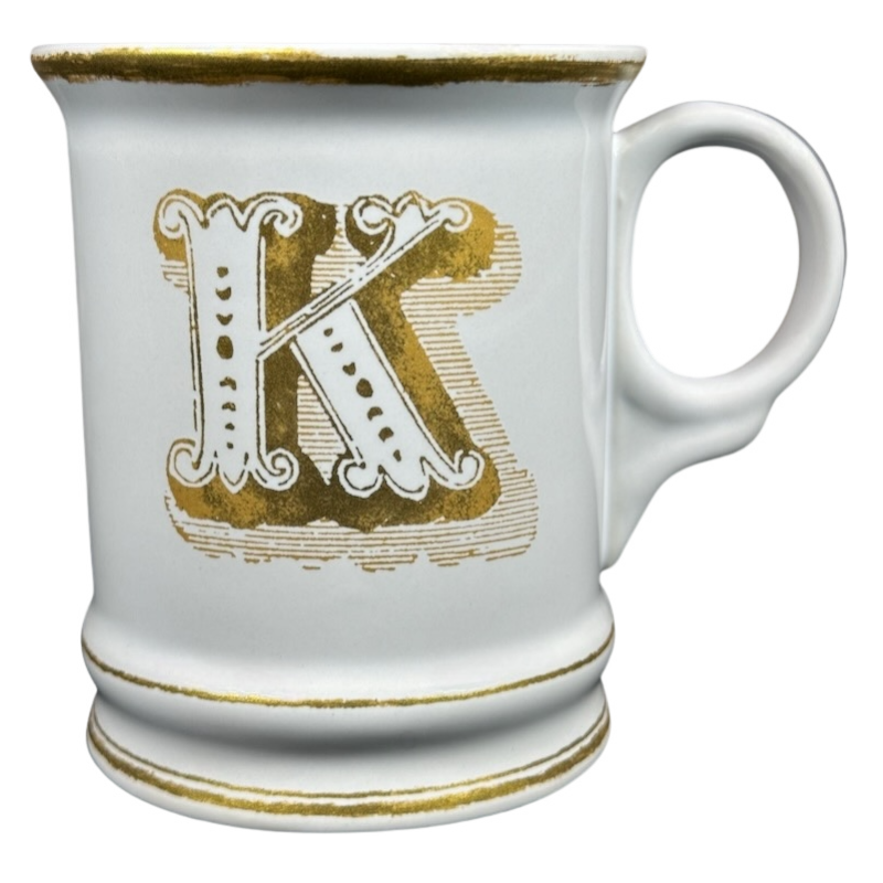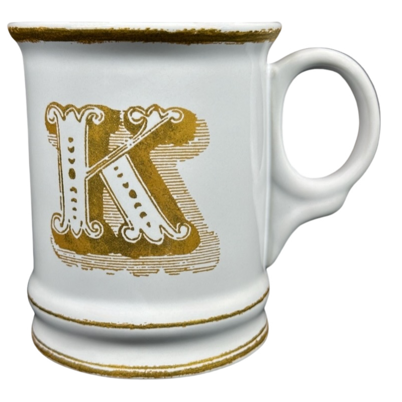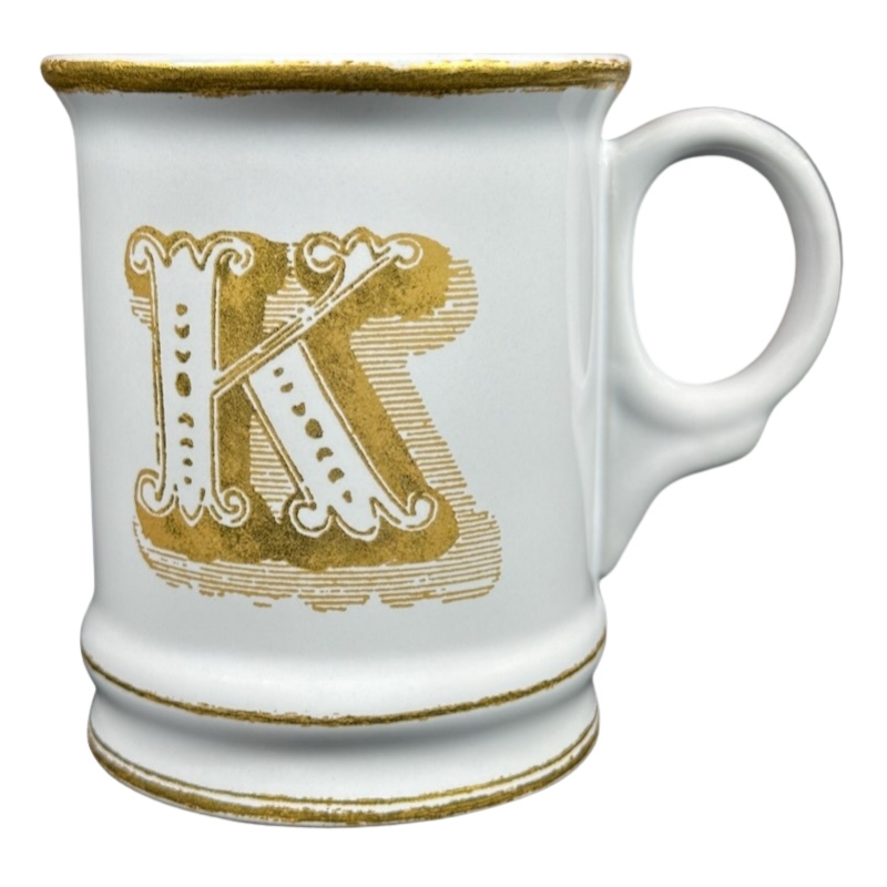 Features artwork on the front that depicts a large letter "K" printed in gold.