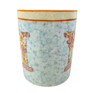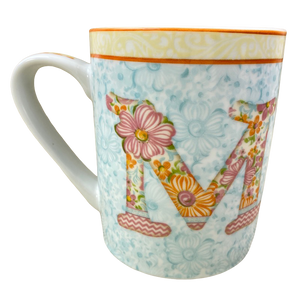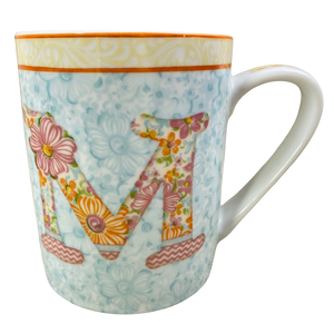 This beautiful mug features a large letter "M" on its front ad rear surface that is entirely filled in with floral artwork.