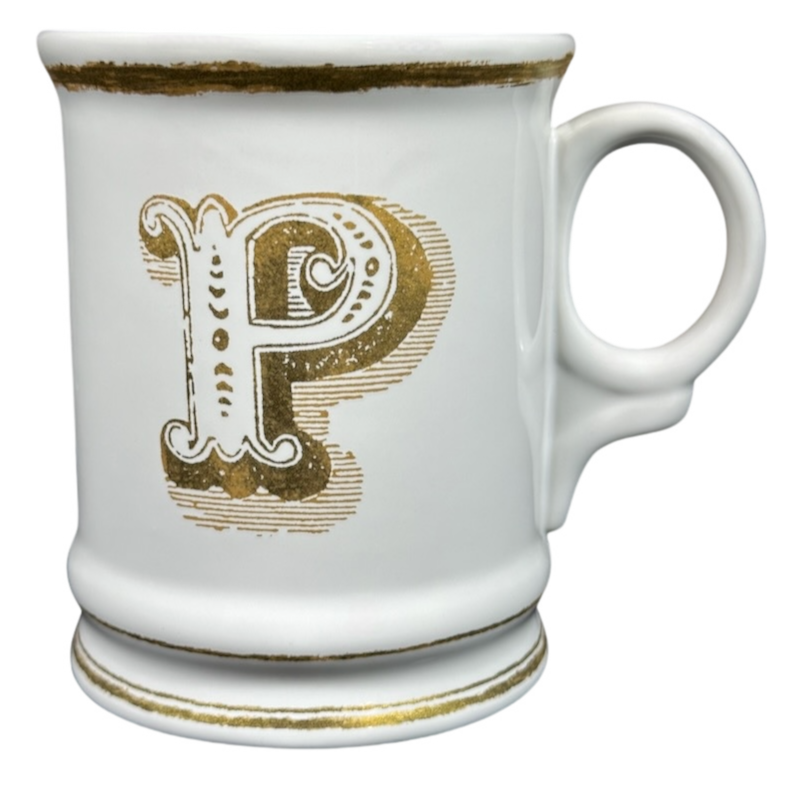 Features artwork on the front that depicts a large letter "P" printed in gold.