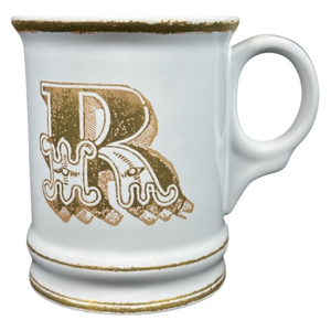 Features artwork on the front that depicts a large letter "R" printed in gold.