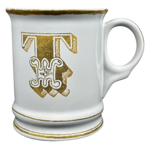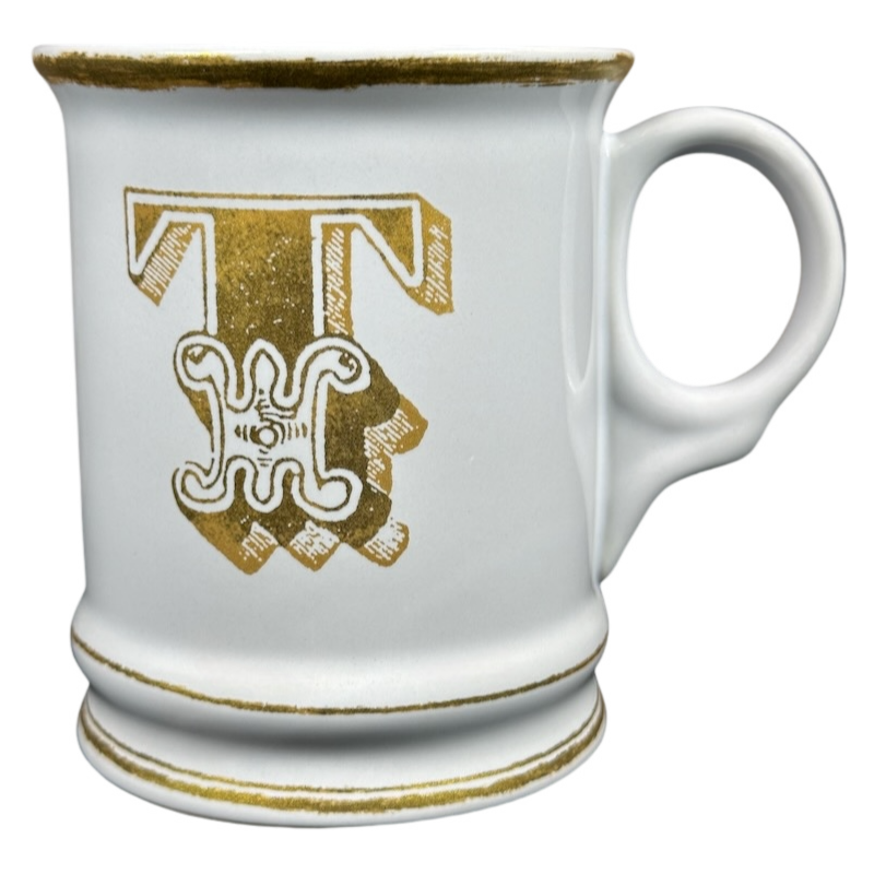 Features artwork on the front that depicts a large letter "T" printed in gold.