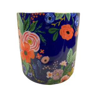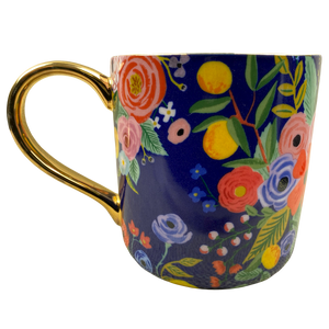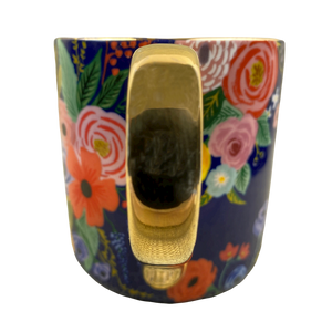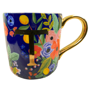 Features a beautiful floral pattern wrapping around its exterior surface with the letter "t" printed on the front surface in a gold font.