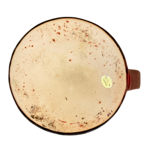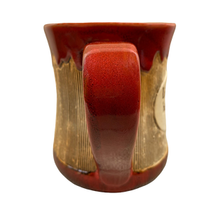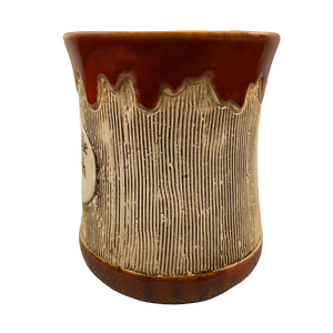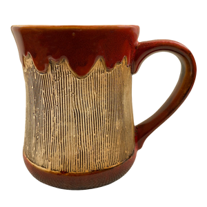 This is a very unique and beautiful mug. It features a vertically ridged textured surface wrapping around its exterior with a drip glaze like pattern above this.