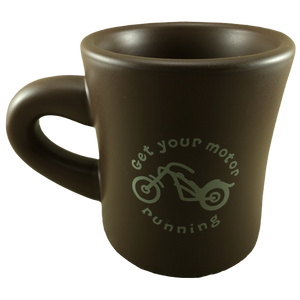 Printed on the rear is an image of a motorcycle with "Get your motor" printed above it and "running" below it.